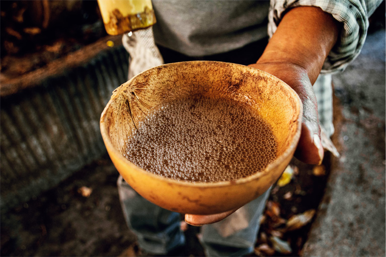 Así iniciamos la fermentación de este manjar que nos llevará finalmente a la destilación en donde calentamos el producto fermentado para concentrar los alcoholes de la mezcla con alambiques de cobre y recipientes de barro.